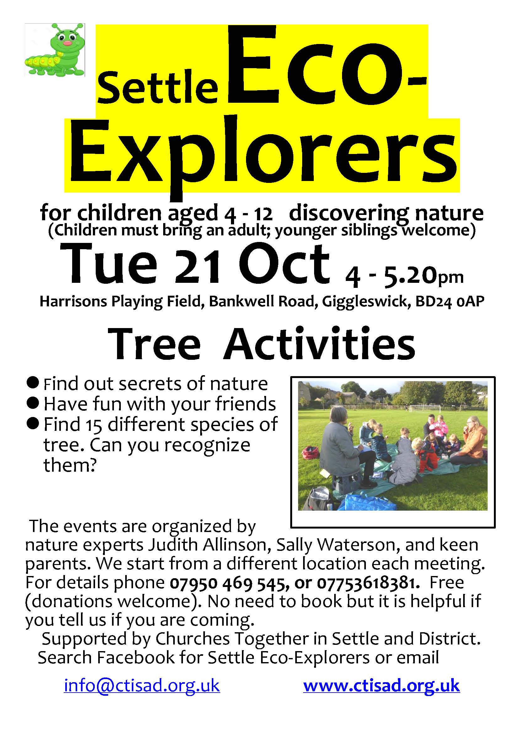 Wed 1 Oct: Coffee Morning for Brain Tumour Research Download the ---------------------------------------- Church Council Meeting: 2 Oct 2pm (Not 18 Sept) 8 Oct: Bible Book Club - Led by Revd. Tim Broughton: noon. - We will be looking at John's gospel. Wd 15 Oct: 2.30pm Bible Study at Limestone view Matthew ch 27 45-end Settle Hang-Out: Has now started for the autumnr 7pm on Wednesday Evenings at St John's. : for people aged 11-17. Settle Youth Café is supported by local churches Tue 21 Oct: Settle Eco-Explorers Meet at Harrisons Playing Fields (i.e. Giggleswick field and childrens playground) at 4pm. We will look for 15 - Yes Fifteen different species of tree. For families /Children aged 4-11 with an accompanying adult. (Yes this is a repeat of 23 Sept which was very successful and we shall search for more trees.). No need to book but it is helpful if you tell us. Wed 15 Oct 2pm: Prayers in the garden for the environment. Sat 25 Oct 2.30pm Giggleswick and Settle Brass Band Concert Time Together Tuesday These weekly sessions are led by a Dementia Forward Adviser supported by church and community volunteers. A gentle café where information, advice and friendship are offered in big dollops for both persons living with Dementia and carers. The weekly sessions are held between 1.30 and 3.30 pm. We charge £3. All are very welcome 25 Dec: Settle Community Christmas Day Meal enquiries ------------------------------------- SOME PAST ACTIVITIES: 1 Dec: Walk for the Climate: To the bird Hide at Long Preston Deeps and to look at Wildlife Garden in Long Preston. Eco Explorers Summer Day Camp at Lower Winskill Farm 28,29 August: Three families attended on the first day and 16 families on the second day 25 June: Settle Hustings. Marian McNichol chairs themeeting. Seven candidates attend: The candidates relax in the Eco-Garden beofre the Hustings. Churches Together first of the month walk: Fri 1 Dec 2023 Above Stainforth. We read prayers about COP28 and about Gaza/Palestine.
